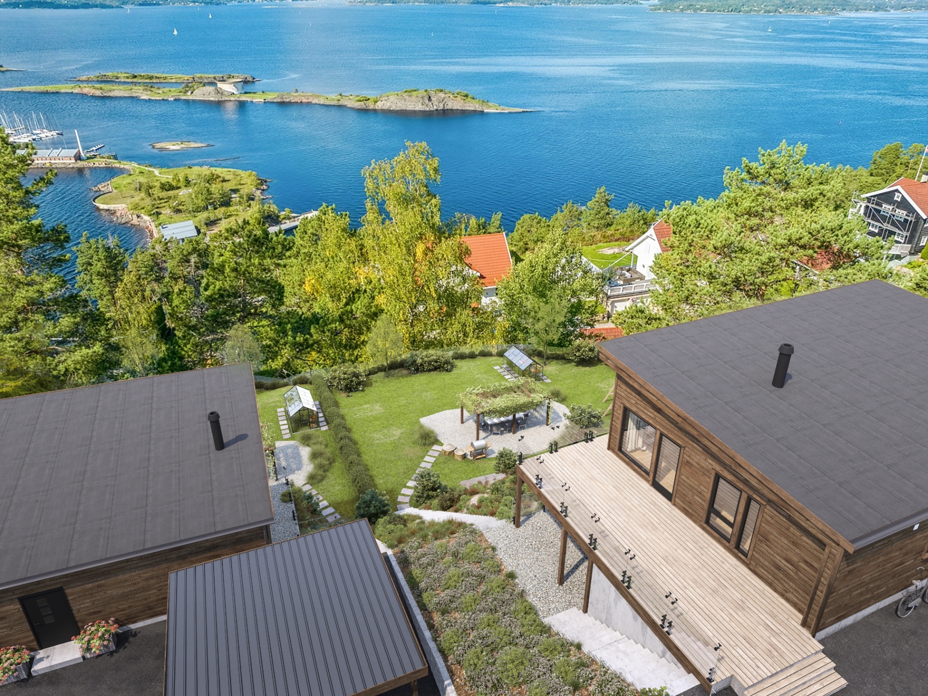 Oversikt over tomten med utsikt over Oslofjorden.
