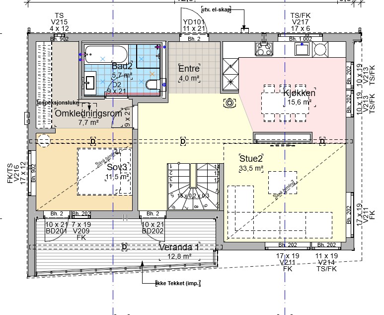 Hovedetasje – stue, kjøkken, bad, entré, veranda